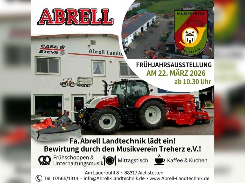 Der Musikverein Treherz übernimmt bei der Frühjahrsausstellung der Firma Abrell Landtechnik am Sonntag, den 22. März 2026 die Bewirtung der Gäste.